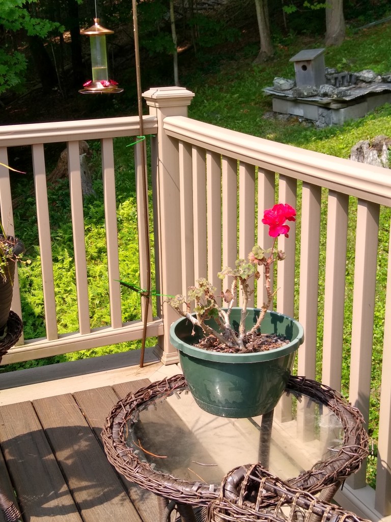I have one geranium plant in a pot that I nursed inside through the gray winter and nearly lost anyway when I left it out in a three-day spring rainstorm. They love hot sun (they grew like weeds in our California backyard) and the leaves turned sickly mud-yellow in the chill damp of Vermont. I brought the pot back inside and let it dry out and hoped for the best. Eureka! The leaves went back to healthy green, and a few days ago I noticed buds. So I put it back outside in the hot sun, and I now have one beautiful blazing red bloom.